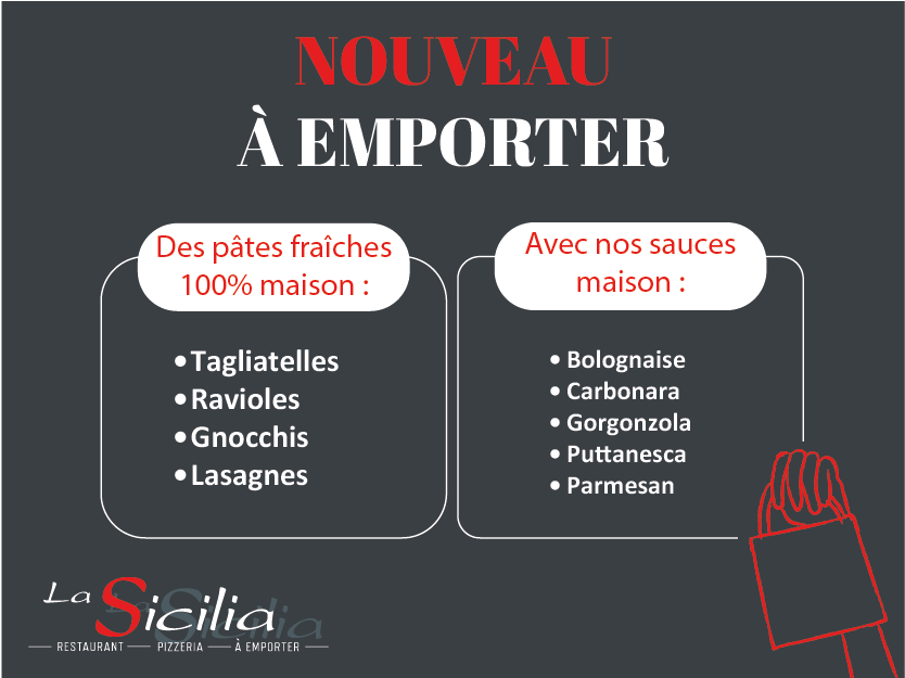 Dans un soucis de vous ravir les papilles, La Sicilia se réinvente ! En plus de ses pizzas déjà reconnues, nous vous proposons des ravioles, tagliatelles, gnocchis et lasagnes entièrement "fait maison".